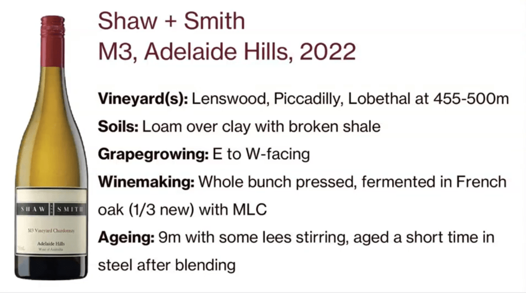 Shaw + Smith was established in 1989 by cousins Micheal Hill-Smith and Martin Shaw. ‘M3’ in the name of the wine includes Matthew who no longer works with the company. Their approach is to manage vineyard sustainably, valuing vine and soil health and low yields. This winery has gone through the change of different styles of chardonnays. 20 years ago, the vineyards were much lower down the hills so the wines were much richer and bolder. Then they moved up the hill 10 years later to achieve the delicate chardonnays we have today. The quality of these wines is exceptional especially at their price point. Jimmy uses this wine for his WSET3 and Diploma course. (I know as I have tried them).